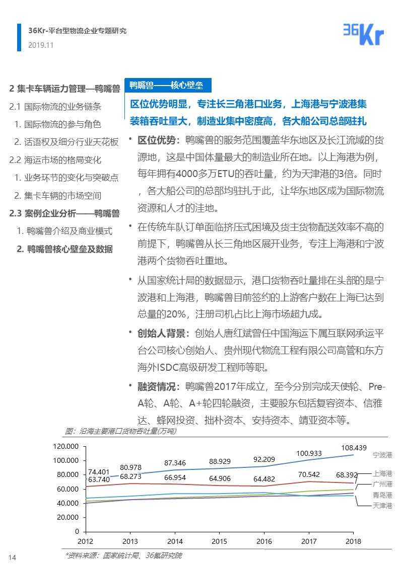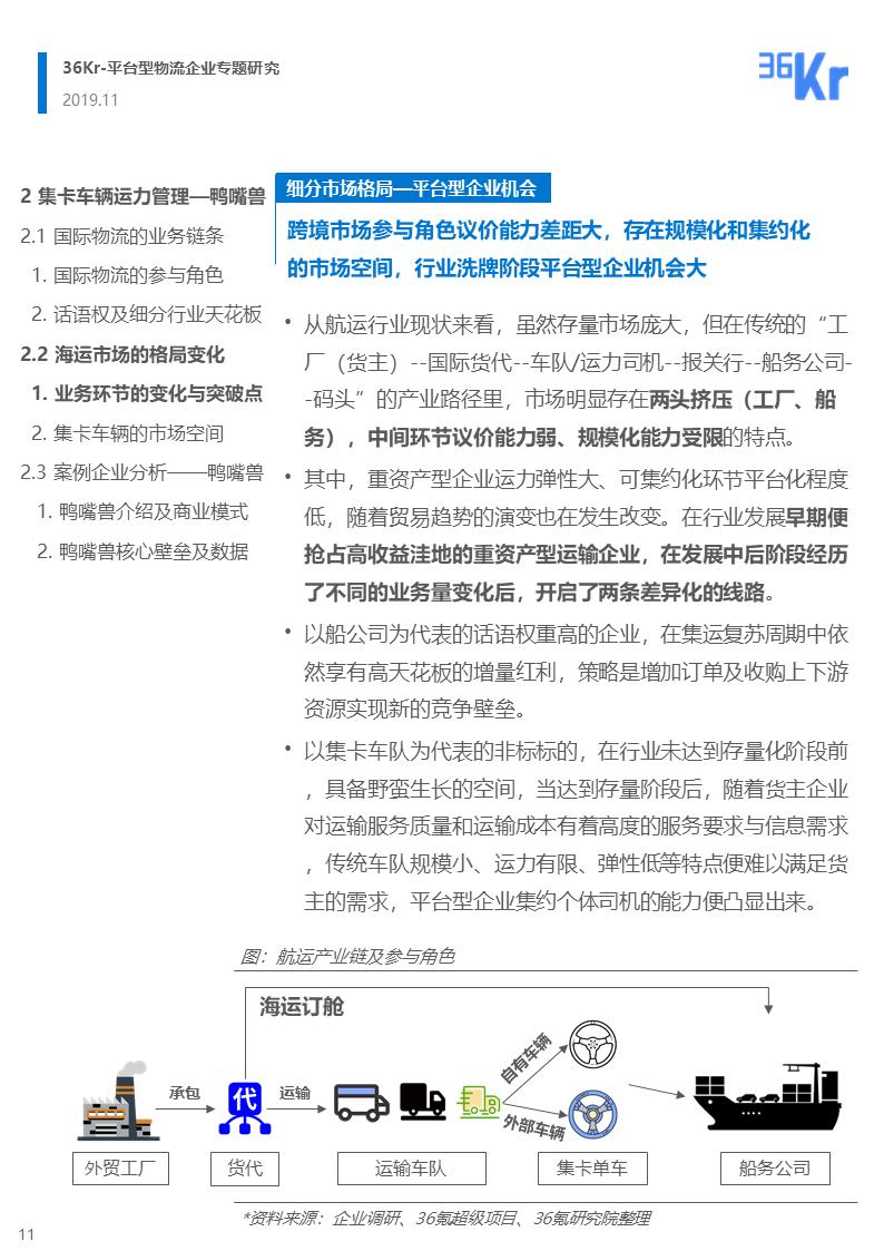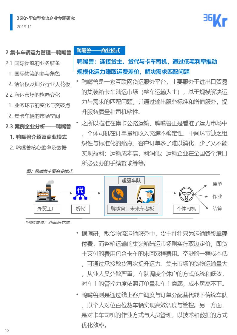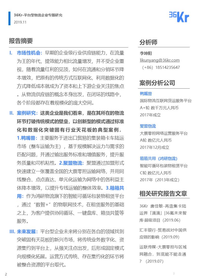 本报告分为五个章节,将分别从国际物流的集卡货运服务、大票零担的专线运输整合、智能可循环包装三个细分行业进行切入,对3家企业进行重点分析。输出我们对平台型企业成长性、主要业务模式、标准化与数据化过程、投资角度、未来趋势等多方面的观点。