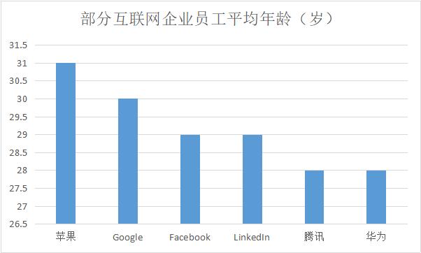 这一点,放在互联网行业尤其明显。美国知名调查机构PayScale的数据显示,2018年苹果员工的平均年龄是31岁,Google是30岁,Facebook、linkedIn是29岁。而在国内,腾讯、华为的员工平均年龄都在28岁左右。