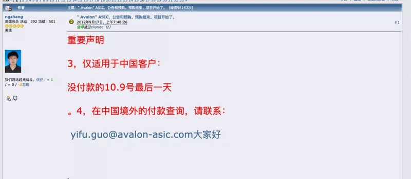 也正是在这次预售中,郭逸夫这个名字,正式出现在阿瓦隆项目中。南瓜张发帖称,境外用户想要购买矿机,可以联系郭逸夫的邮箱。