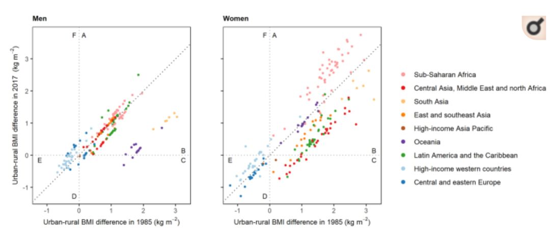 ■1985年的农村和城市平均BMI与2017年的差异 来源:《自然》