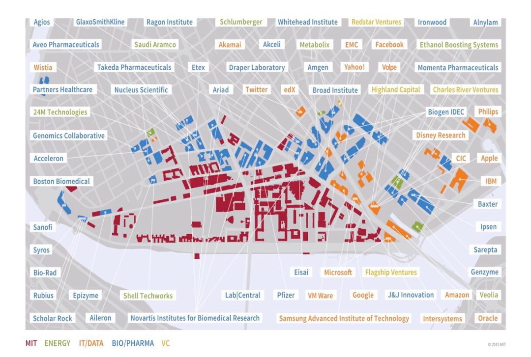 你看上图当中,红色部分是麻省理工学院校舍,绿色的那些建筑物是能源公司,橘色的那些建筑物是IT和数据公司,蓝色的那些建筑物是生物制药公司,而黄色的建筑物是风险投资公司。所有这些公司把麻省理工大学(MIT)团团围住。