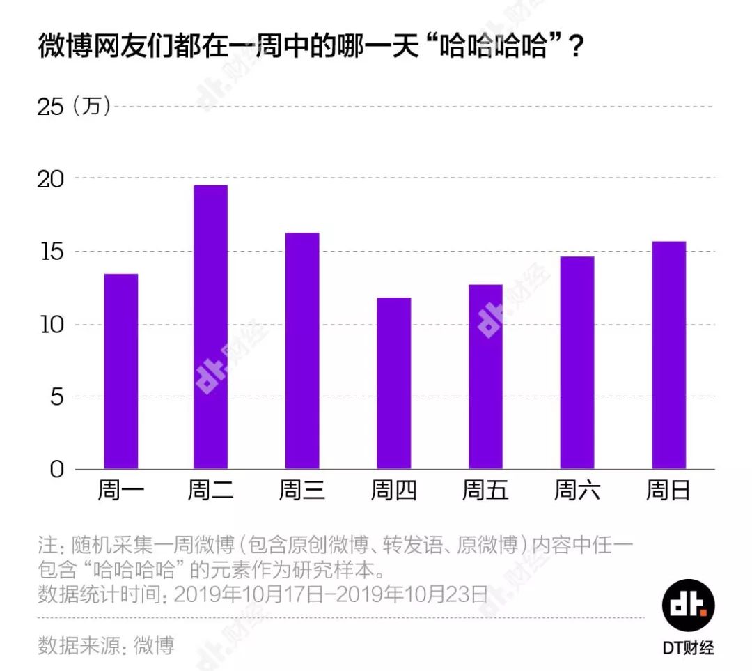 所以我们随机采集了微博上一周时间内(2019年10月17至2019年10月23日),总共超过100万条转发或原创内容中带有“哈哈哈哈”(连续4个哈)的微博,窥探一下社会人们的快乐源泉。