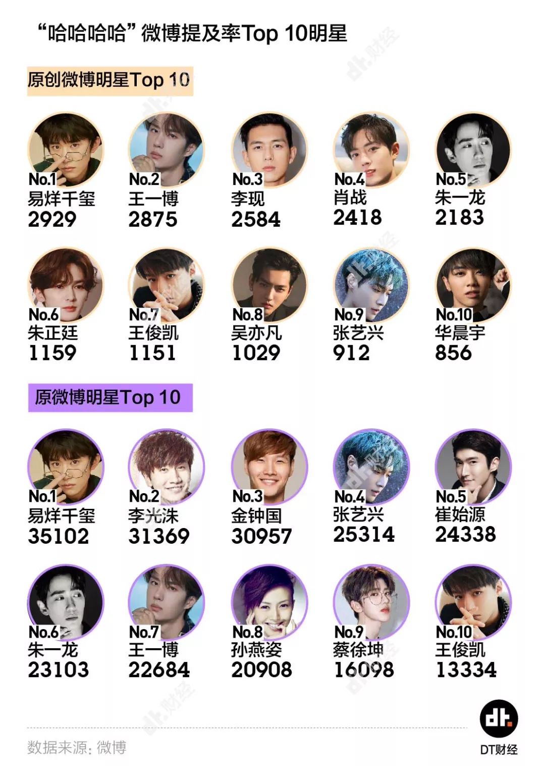 其中,原创“哈哈哈哈”微博提及的明星Top 10是清一色的热门偶像,占据两榜第一的易烊千玺成为了互联网上最大的快乐源泉。