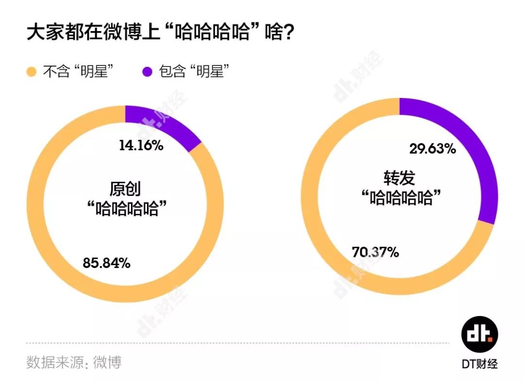 DT君分析了100万条微博后发现,在不考虑明星昵称和绰号的情况下,“哈哈哈哈”微博中提及明星的比例就已经将近三成。