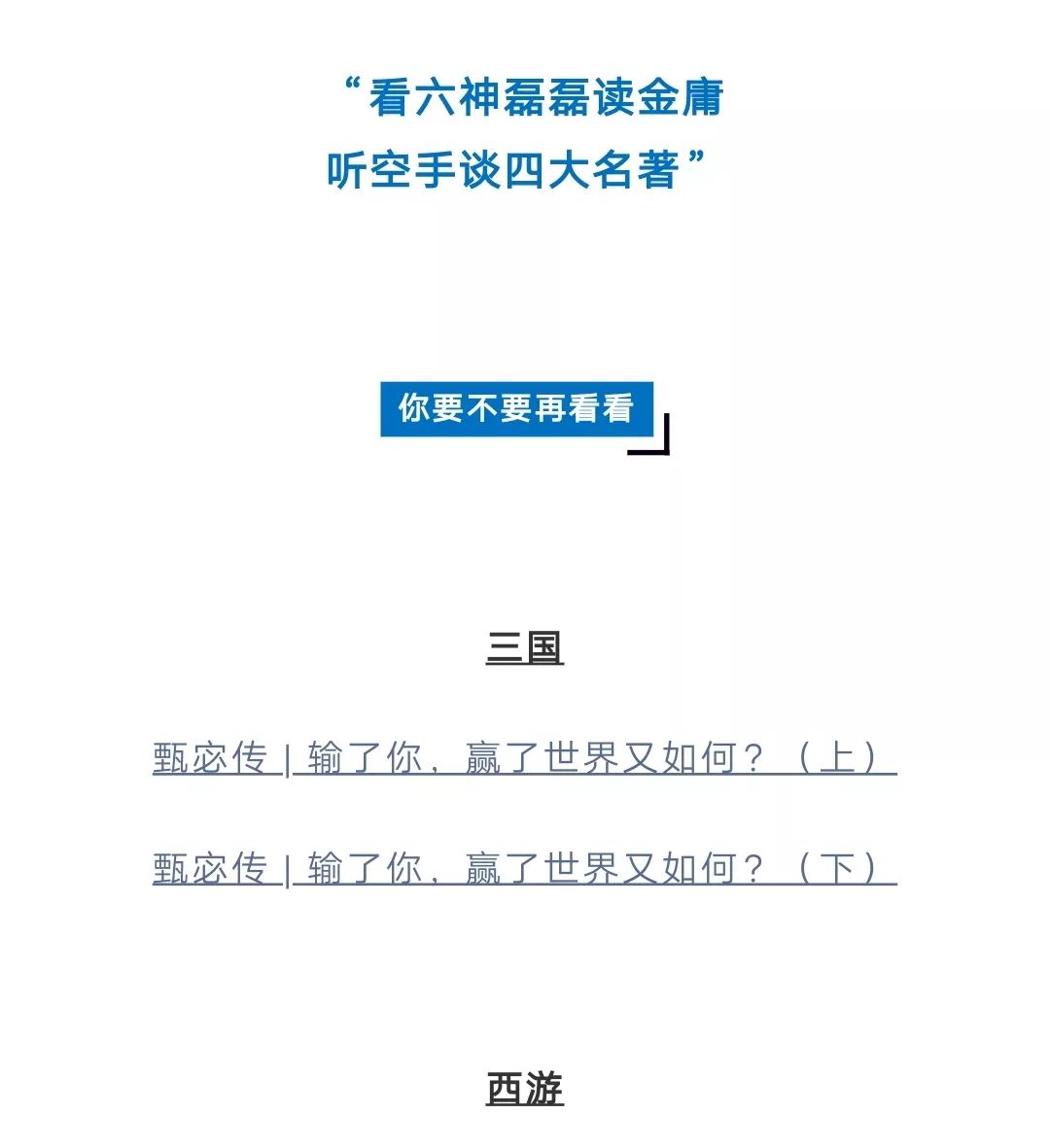 而能够和金庸小说相媲美的国民级IP,我想那只有四大名著了,这个群众基础可太广了。于是,我就把读书内容向前延伸了一步,专门写了一系列谈四大名著的文章。