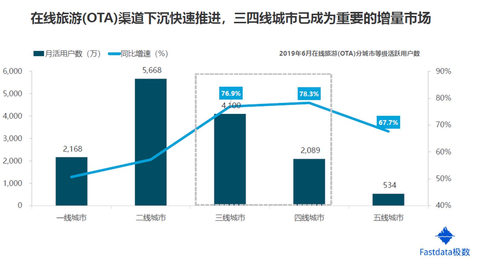 财务报告显示,三季度同程艺龙来自非一线城市的注册用户比例保持在85.5%,约63.3%的新增付费微信用户来自三线以下城市,较2018年同期的58.8%有所提升。虽然没有赶上互联网圈内第一波“上山下乡”运动,但是基于微信生态平台,同程艺龙在挖掘下沉市场方面的效率却后来居上,且目前已经进入到了收获阶段,后劲也依然值得期待。Fastdata日前发布的一份报告显示,来自三线及四线城市的OTA月活增速分别为76.9%和78.3%,已经成为重要的增量市场。