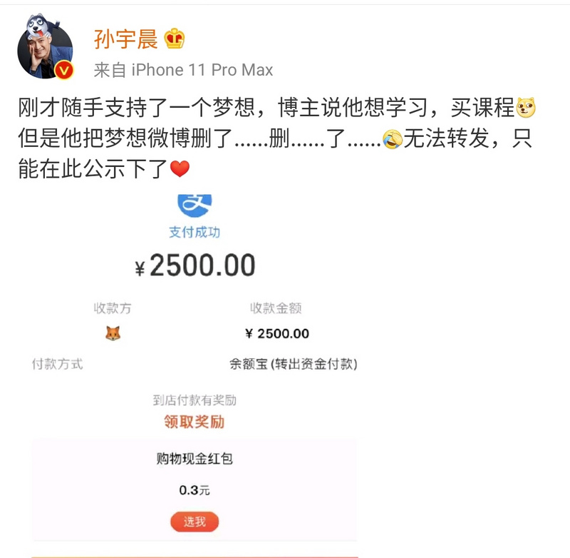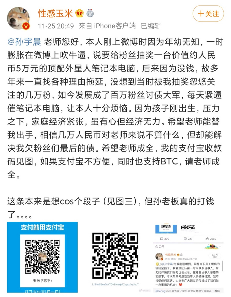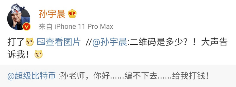 甚至一些吐槽的大V,最后也被孙宇晨“强行打钱”了。