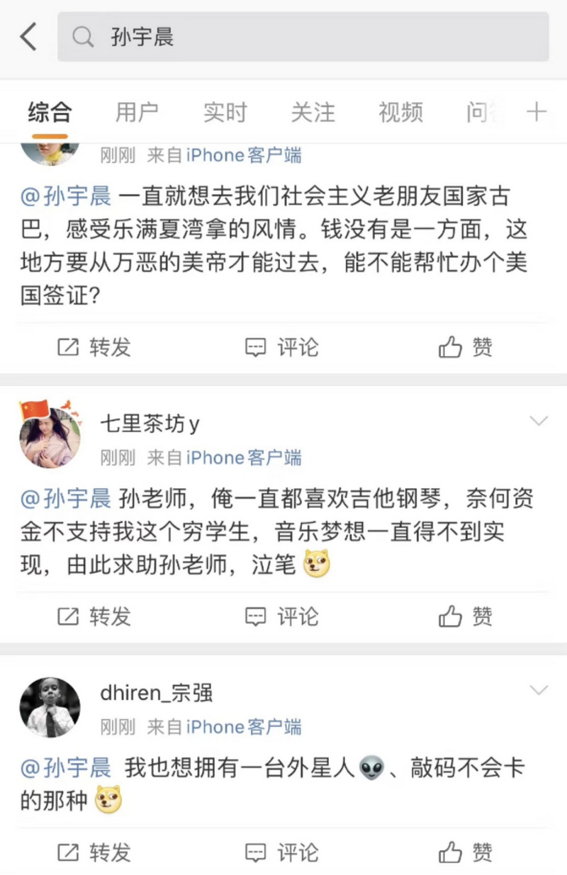 在很多派钱帖底下不乏“乞讨”的素人(非大V),孙宇晨多不予理会,即使它们的“梦想”看着更真切感人。