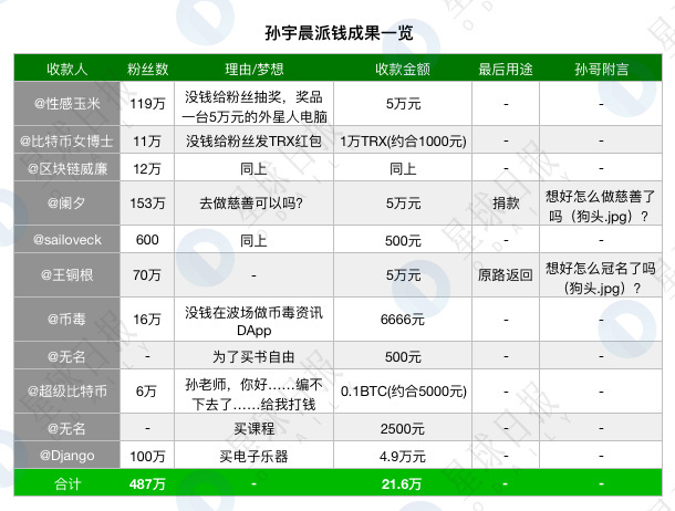 Odaily星球日报数了下,孙宇晨一共给11位微博用户打钱,这些用户中除一位粉丝不上万以外,其它均为大V。而这位粉丝仅有数百的素人,是因为其明确说明想用500元做慈善,孙宇晨才打款。