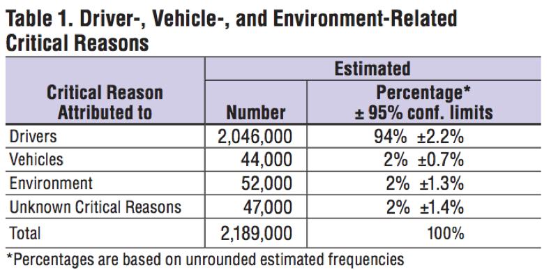 根据美国交通部的数据,近94%的致命车祸是由于人为失误造成的。(数据来源:见图表)