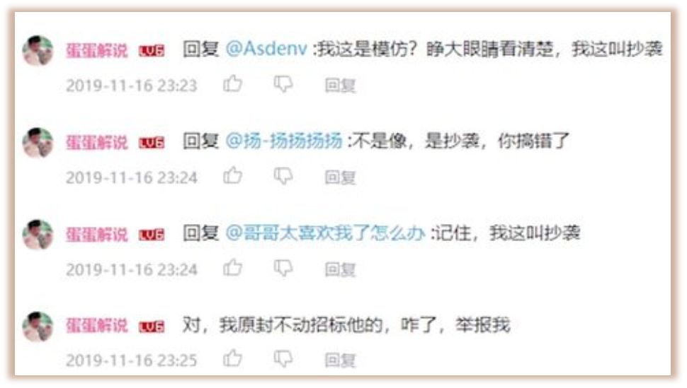 近日,坐拥600万粉丝的微博大V“蛋蛋解说”被网友曝出抄袭问题。博主邵艾伦指责其视频内容创意“抄袭”了自己的作品,并通过图文对比进行了指证。但是“蛋蛋解说”丝毫不在意,并在网友的评论下面回复“快点举报我”……