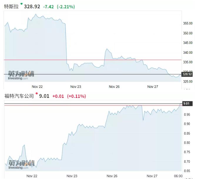 Cybertruck发布后,特斯拉与福特的股价走势对比(截至11月26日)