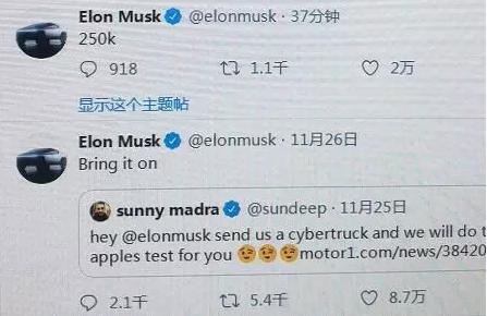 每经小编(微信号:nbdnews)注意到,就在和福特“约架”成功后不久,北京时间今天(11月27日)上午,马斯克又在社交媒体上表示,自22日发布以来,Cybertruck已收获25万订单。