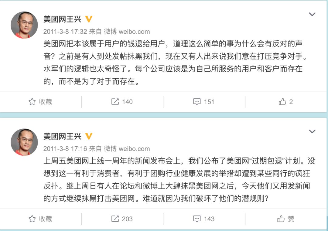 除了晒账户余额这一招,其实王兴的杀手锏,还在于高效的管理和综合运营效率。在对手纷纷砸广告的时候,美团的钱用于买百度关键词,同行启迪了用户的心智,王兴坐收渔翁之利。并冒天下之大不韪(同行的敌视),率先推出退款举动,以前的团购用户想要退款是极不容易的。王兴是这样设计的:当消费者被启迪心智知道了团购,想到的最好的服务商是美团。他的目的就达到了。