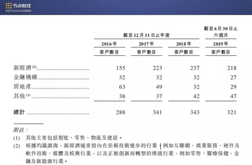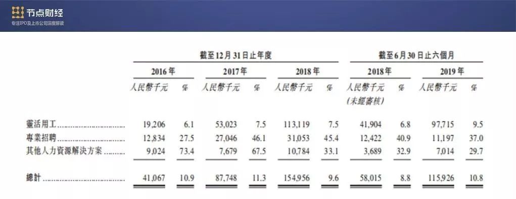 招股书中显示,人瑞人才的客户范围有新经济行业、金融机构、房地产及其他。其中新经济企业占比最大,配置了超过1.67万名灵活用工员工,占截至2019年6月30日配置灵活用工员工总数的83%。2016—2019上半年,人瑞人才的总收益分别为3.76亿元、7.76亿元、16.16亿元和9.61亿元。其中在2016-2018年,中国新经济行业客户为人瑞人才分别贡献了总收益的约65.3%、81.4%、81.7%及82.7%,年复合增长率达到107.2%。