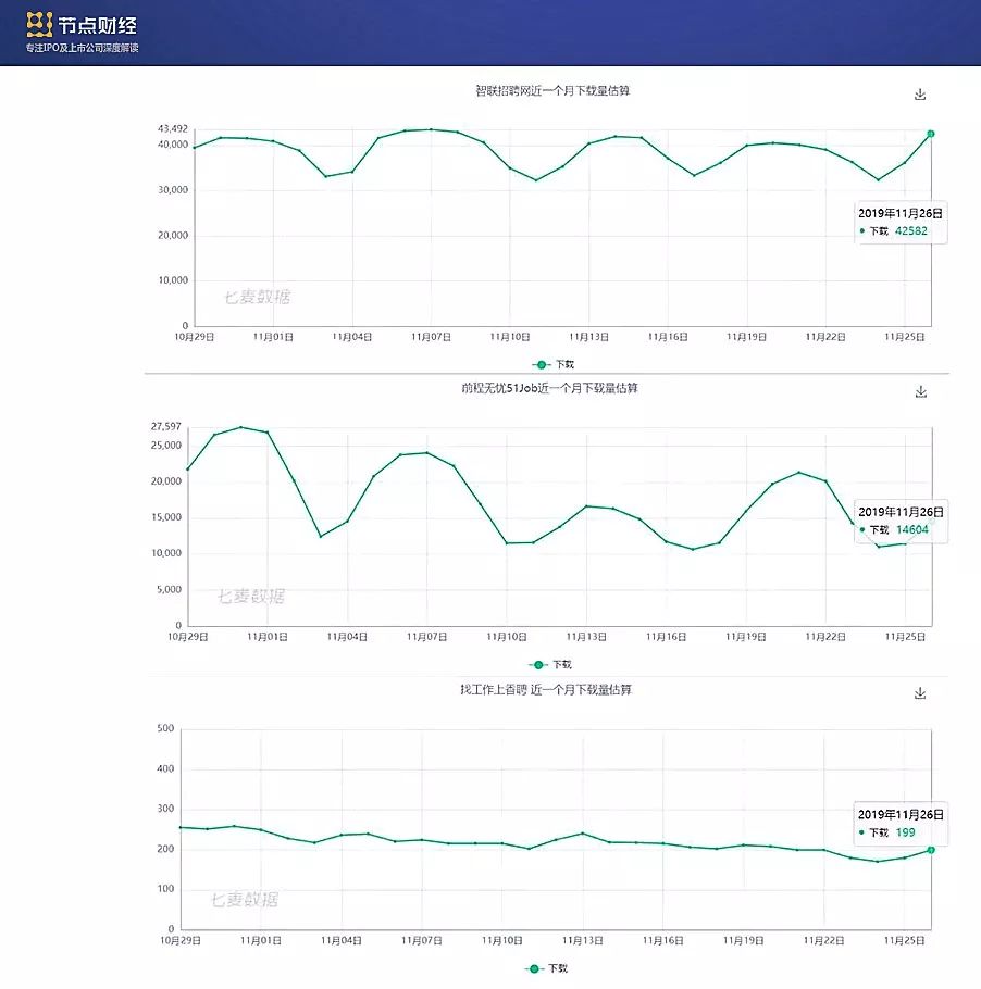 据七麦数据显示,香聘下载量相比智联招聘、前程无忧等仍有很大差距,近一个月,智联招聘日均下载量维持在30000-40000的量级,而香聘的数据为200-300之间。