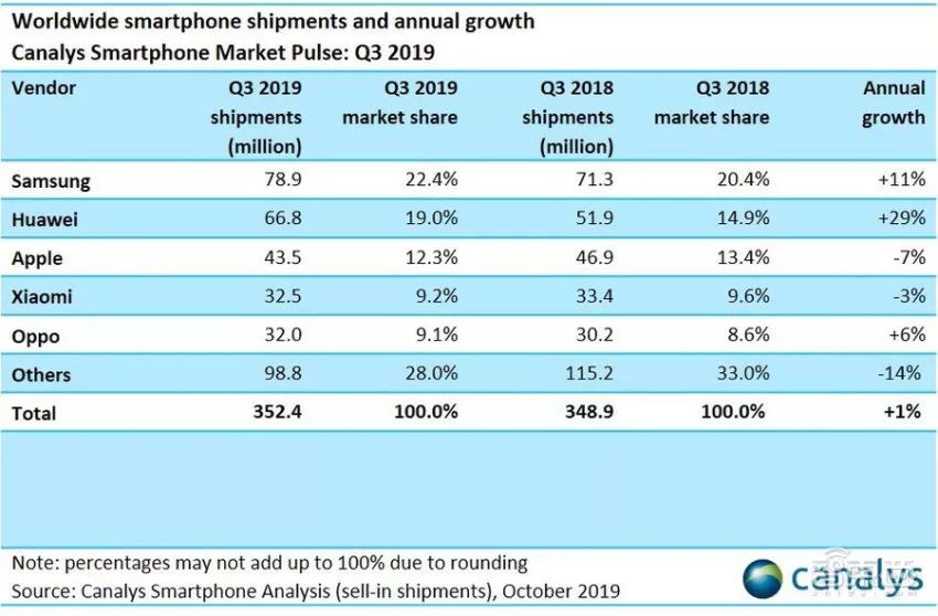 ▲2019年三季度全球智能手机市场份额