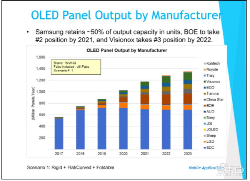 面板研究机构Display Supply Chain Consultants(简称DSCC)在2019年液晶面板研究报告中预测,到2023年,三星仍将在OLED领域保持50%以上的市场份额,京东方将在2021年占据第二位置,另一家中国屏幕厂商维信诺将在2022年占据市场第三位置。
