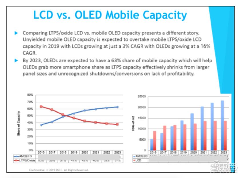 DSCC预测,在移动产品领域,2019年LCD复合年均增长率预计为3%,而OLED的年复合增长率预计为16%。DSCC认为,到2023年,OLED将占据63%的市场份额。