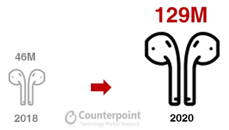 全球TWS耳机的销售确实非常火爆。2019年初,国际知名咨询机构Counterpoint Research公布数据显示,整个2018年TWS耳机的出货量达4600万台,当时Counterpoint预计到2020年,TWS耳机的出货量将达到1.29亿台。