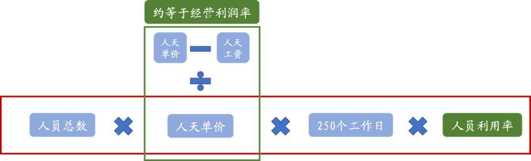 假设把人用到了极致,那公司平均人天单价*工作日数量*员工总数应该与公司的营收划等号。二者之间的差额可以用人员利用率(Utilization Rate)来衡量。