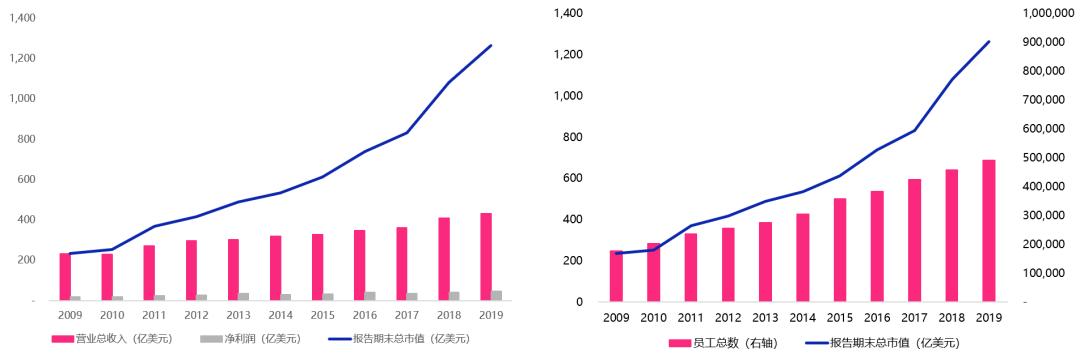 分析近十年来埃森哲的营业收入、净利润、员工总数与总市值的关系,我们发现,单位营收对应的市值(PS),单位净利润对应的市值(PE),与单位员工对应的市值三个指标都在上升。