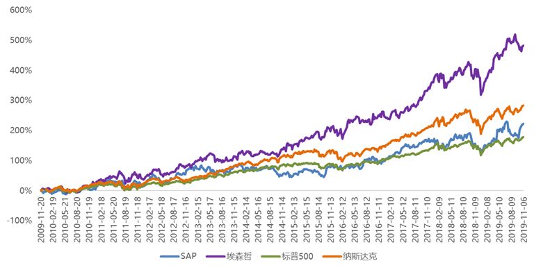 简单比较近十年来埃森哲的股价走势,以及软件厂商老大哥SAP、美股主流指数的涨跌幅可以看出,投资埃森哲的股票有明显的超额收益,不仅仅领先软件厂商,同时还领先于主流指数。