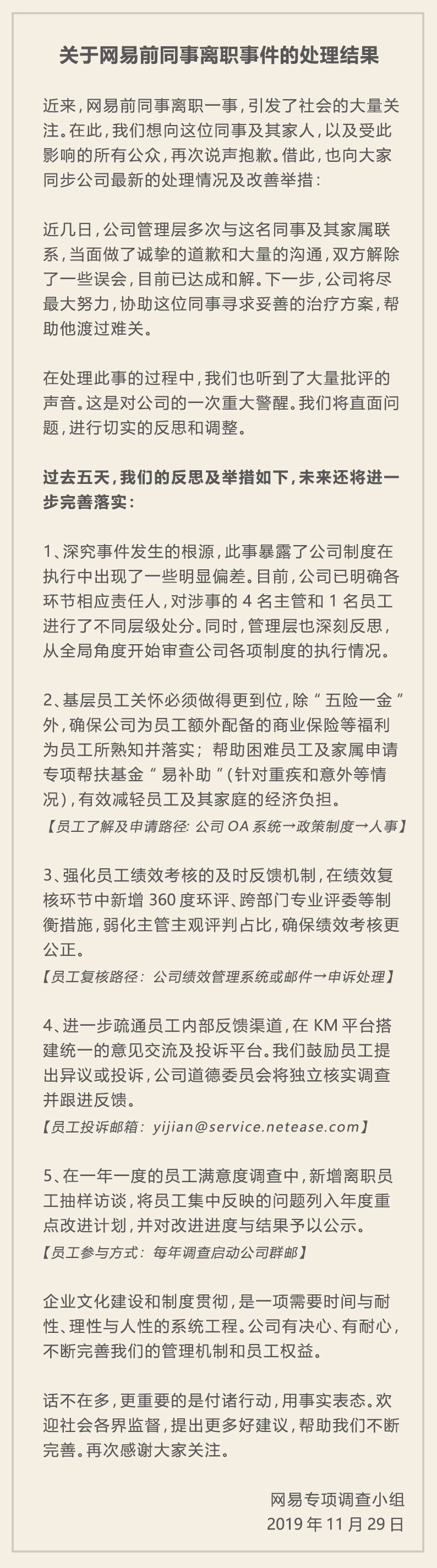 此外,根据《处理结果》,此次事件后网易推出五项具体整改举措:包括对涉事的4名主管和1名员工进行不同层级的处分、强化基层员工关怀机制、强化绩效考核机制、进一步疏通员工内部反馈渠道、将集中反映问题列入年度重点改进计划,并对改进进度与结果予以公示等。