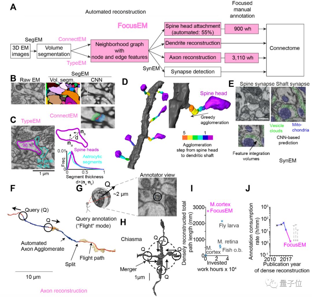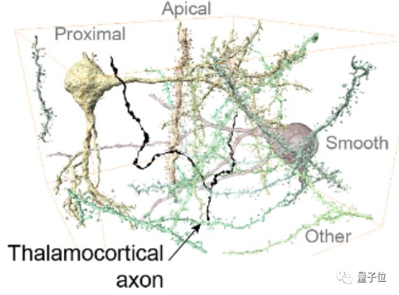 轴突和树突与数据集中的细胞体不连接,并在组织中密集分布,在这部分皮层中约占总神经元路径长度的97%(上图中的G)。