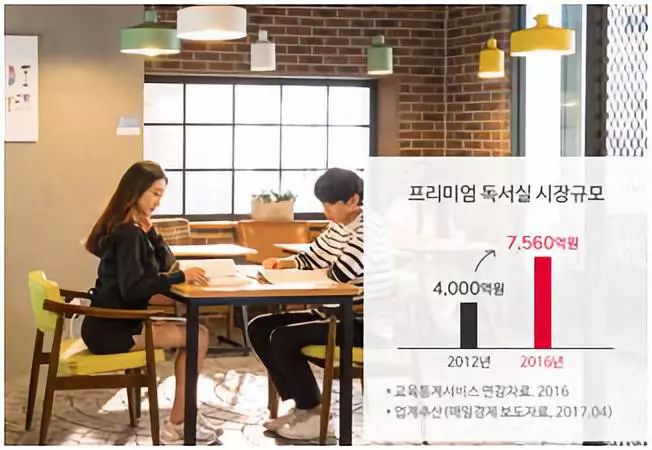 再来看看隔壁韩国邻居的数据,根据《教育服务统计年鉴》报告,从2012-2016年里,高档自习室的市场规模从4000亿韩元跃升至7560亿韩元。