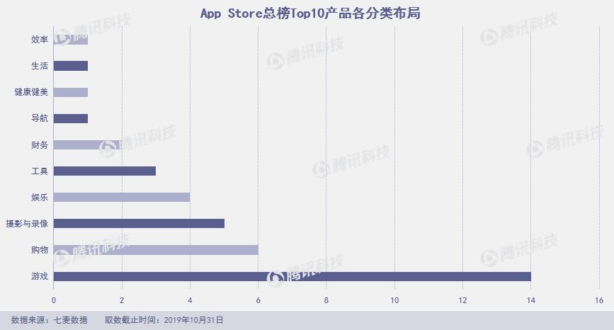 10月,总榜Top 10出现过38款产品,其中14款为游戏类产品,其余分布在购物、摄影、娱乐等类别。