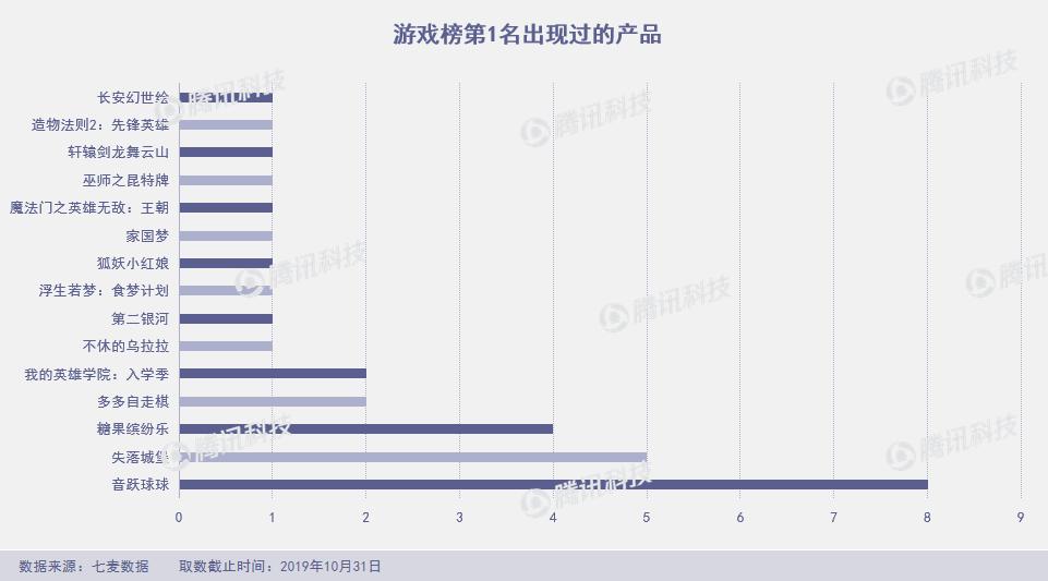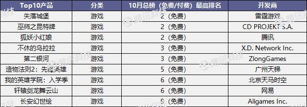 44款产品位居10月游戏榜Top 10,其中9款超过10天出现在游戏榜Top 10。15款曾占据游戏榜单第1名。