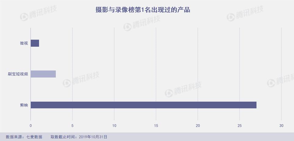10月份3款产品霸榜摄影榜:头条旗下视频剪辑产品“剪映”、聚美优品旗下“刷宝短视频”以及腾讯旗下短视频“微视”。