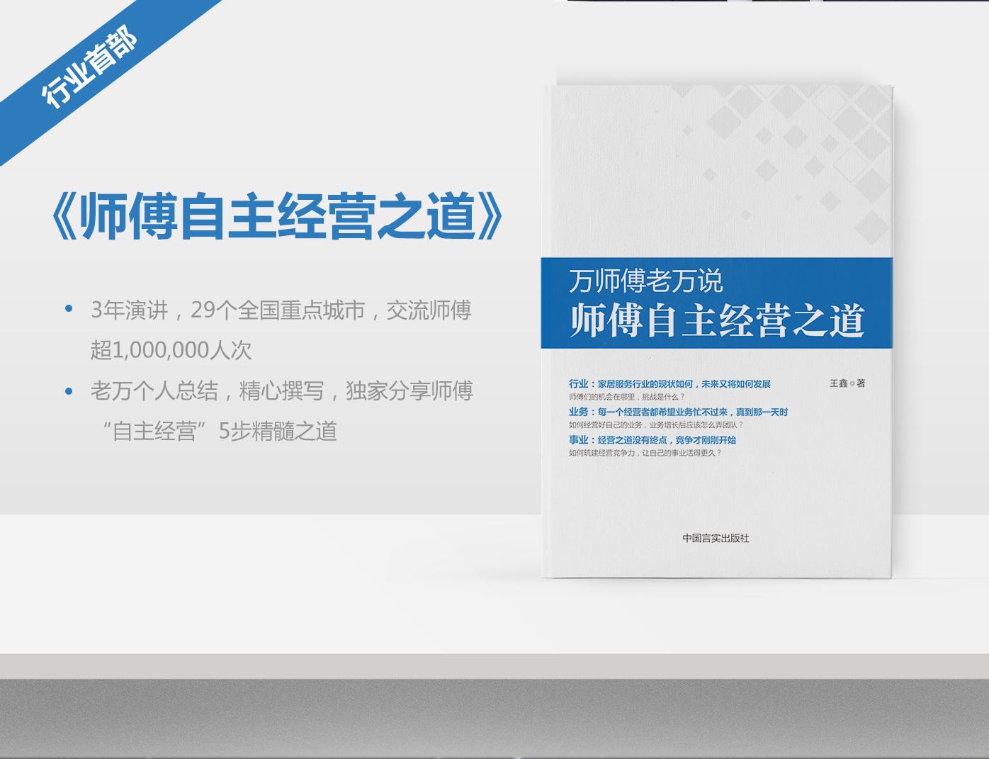 为转变家居师傅的自主经营思维、提高其自主经营能力,万师傅出品行业首部面向广大家居师傅的职场管理类书籍《师傅自主经营之道》,从角色管理、业务管理、团队管理等多个方面对家居行业的自主经营管理进行了较为深入而有针对性的阐述。