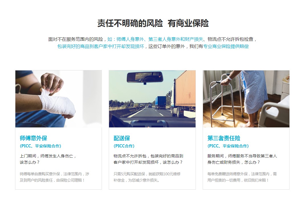 家居售后服务过程中,难免遇到意外的商品损坏或人身安全事故,为用户和师傅提供一份生命财产安全保障,体现的是平台的责任意识,用人性化的行动让用户对平台产生认同感。