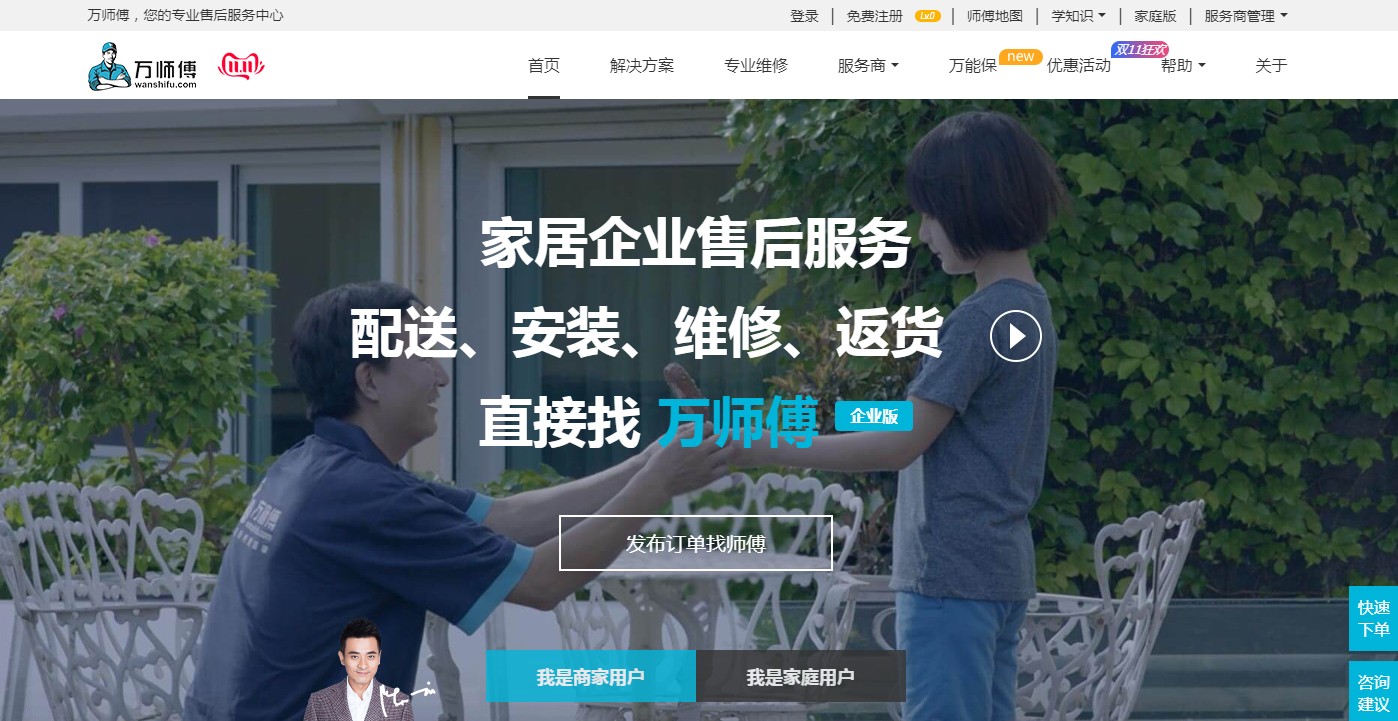 万师傅是一个专业家居售后服务平台,坚持“用户自由选择+师傅自主经营”的理念,连接商家用户或个人用户与师傅,提供家居售后的上门配送、安装、维修、返货等专业服务。