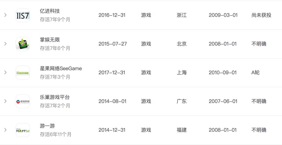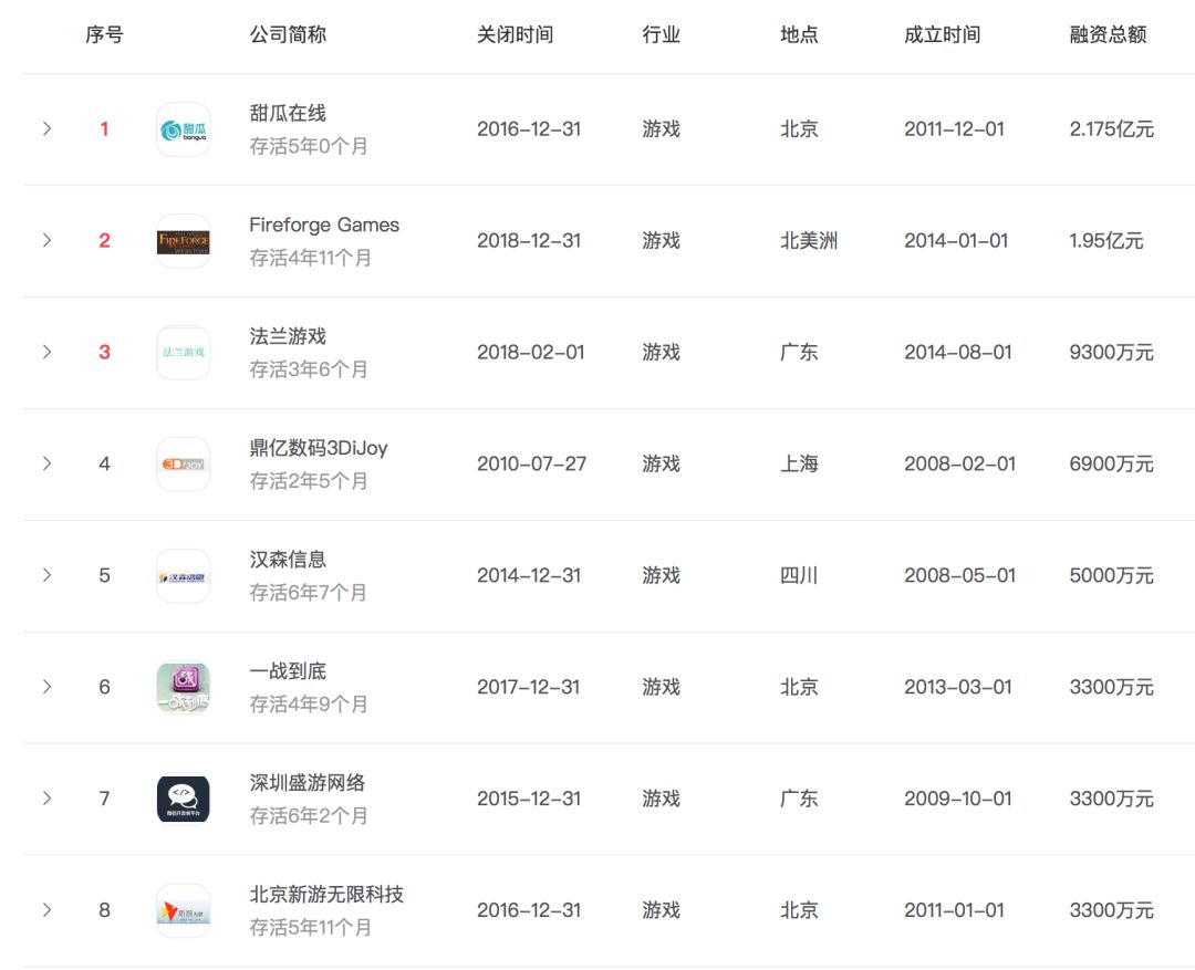 最短命的是成都北冥鱼游戏,去年5月份才成立的公司,在今年6月份已经终结。据了解这是一家由国内一线大厂的辞职员工创立的H5游戏研发公司。目前搜索不到这家公司的产品信息。
