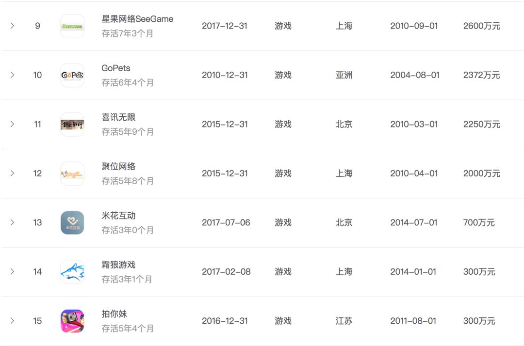 此外,死亡公司融资榜上TOP15的公司共获得了8亿元投资,他们中的大部分都超过了平均存活时长。