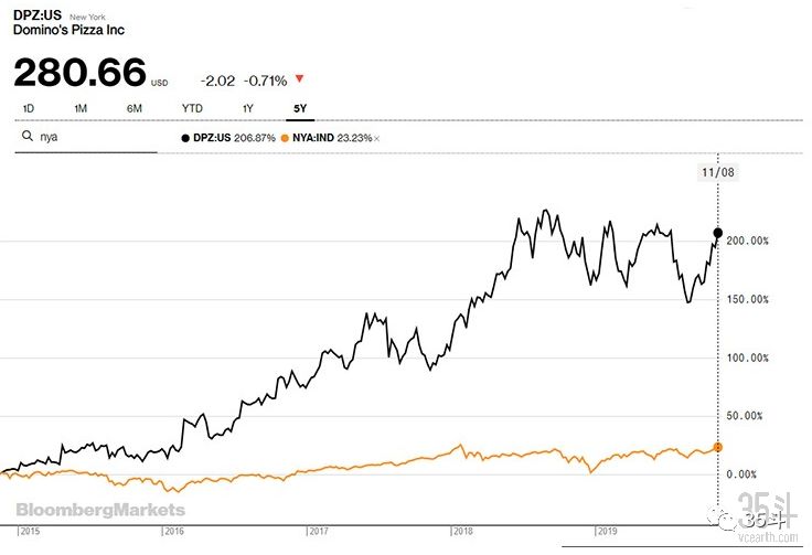 多米诺披萨在过去五年多的时间里取得了巨大的成功