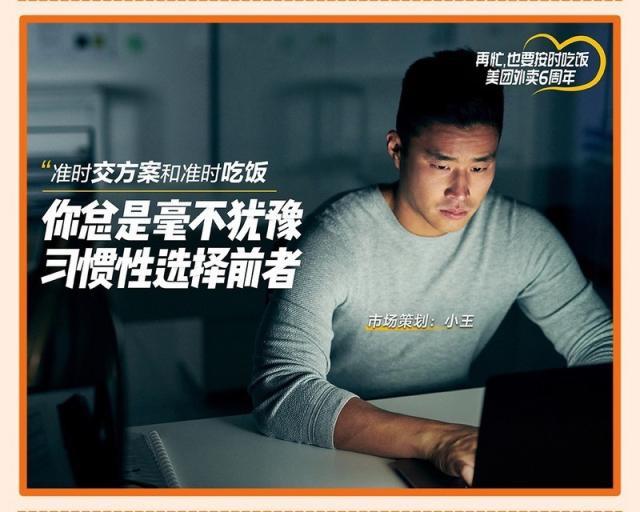 再比如,11月18日美团外卖成立六周年之际发布了《按时吃饭报告》,数据显示,目前国内仍有不少用户吃饭不定时,晚饭不按时最为严重,超过1.02亿人因各种原因无法按时吃晚饭,对此,美团外卖发出倡议,提醒每个为美好生活努力的人——“再忙,也要按时吃饭!”虽然所有人都知道按时吃饭更好,但却很少有人系统性地来推动、引导和普及这一理念,没有谁比美团更合适。