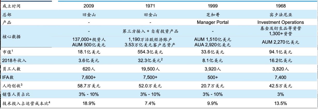 庞大的市场体量和渗透率,催生出一系列超级独角兽公司,且市场高度集中化,其中Top4(Charles Schwab、Envestnet、AssetMark、SEI)累计市值超过700亿美金,市占率达70%。