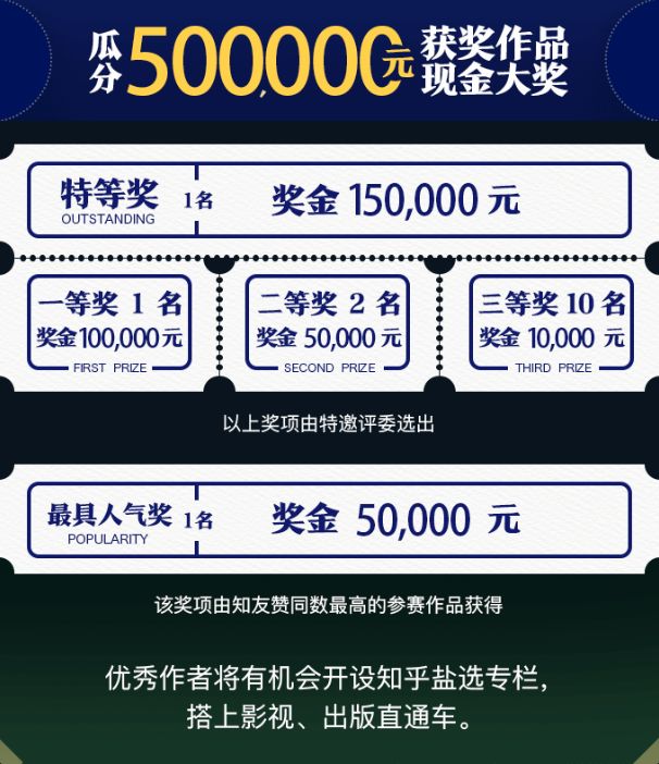 2019 年 11 月 26 日,“知乎故事大赛”上线,每位知乎用户皆可报名参赛,要求分享自己亲身经历或见证过的真实故事,题材不限于职业故事、学习生活、爱情冷暖、家族悲欢等。知乎为这项比赛准备了 500000 元的现金大奖供 15 名获奖者瓜分,还有专栏、影视、出版等商业化权益。