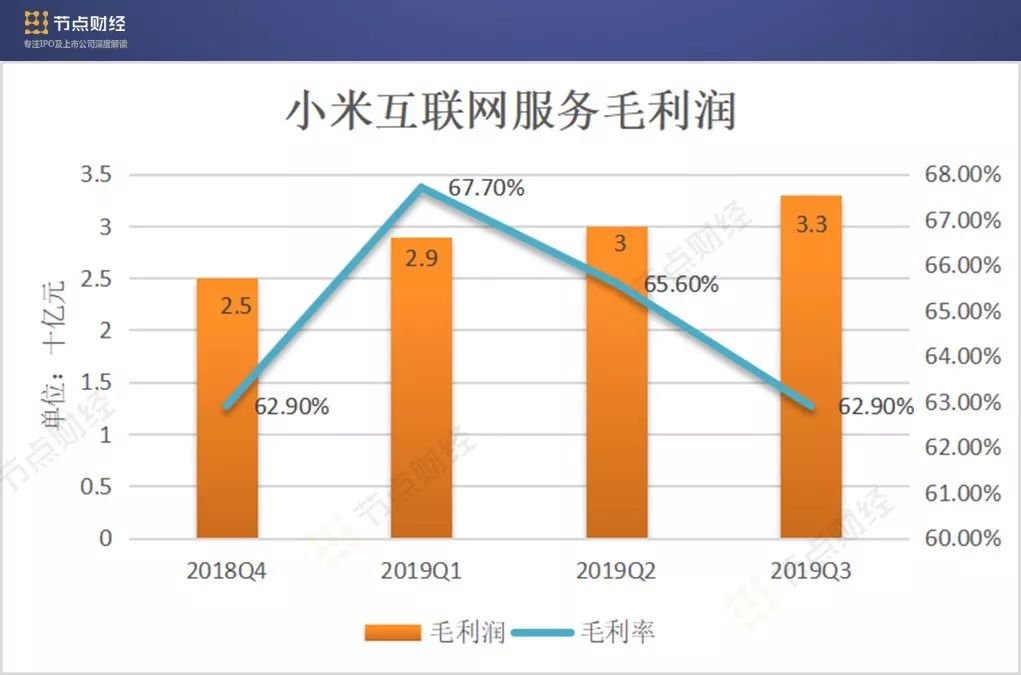 然而从今年二季度开始,小米手机业务的毛利贡献迅速攀升,从2019年一季度的17%飙升到36%,Q3为35%;相反,互联网服务的毛利贡献则从一季度的55%下降至41%,这也是7个季度以来的新低。