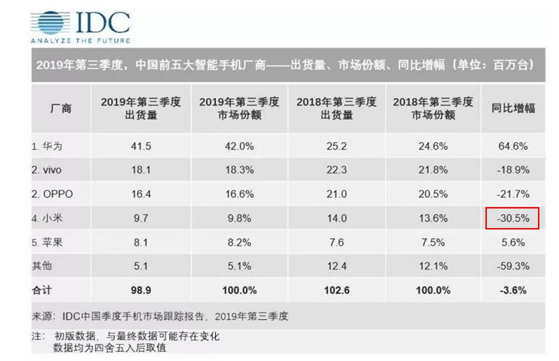 IDC数据也显示,在刚刚过去的三季度小米970万台,同比下降了30.5%。