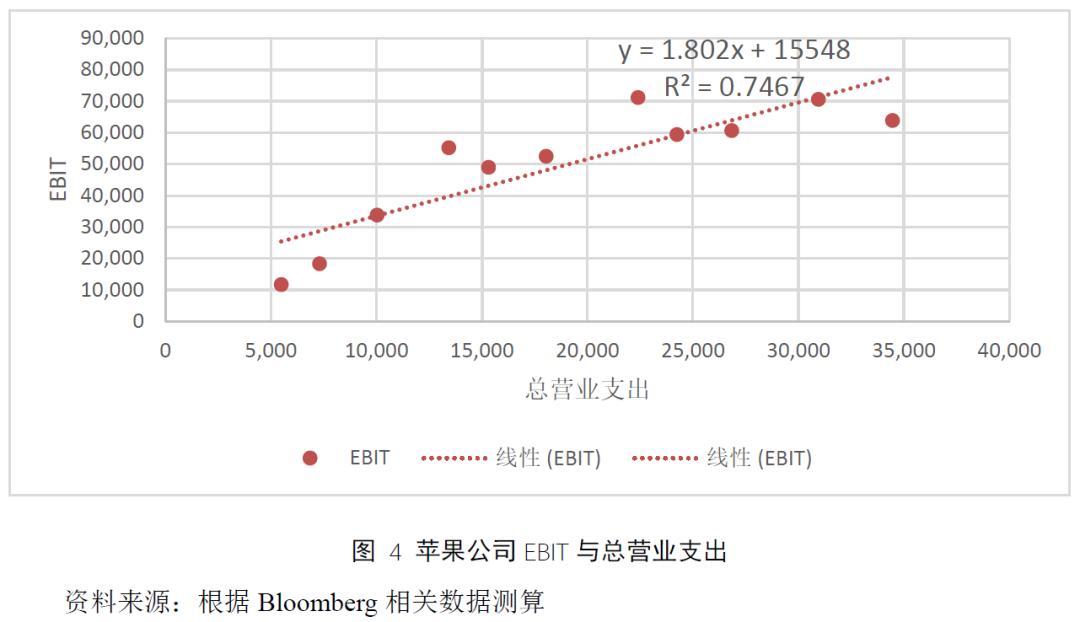 我们采用OLS回归分析,计算苹果公司EBIT与营业总支出的关系,如图 4所示,营业支出每增加1美元,苹果公司可获得1.82美元的息税前利润。