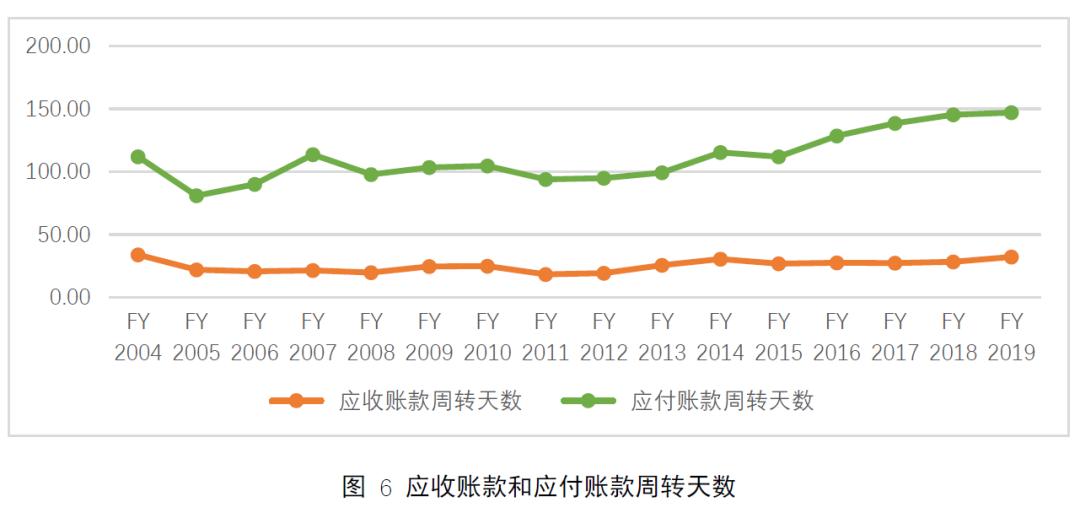 较少的供应商,有利于苹果公司对供应商采取标准化的管理。同时较少的供应商还可以使苹果确保每一类产品的都有巨额的采购需求,提高了苹果对上游供应商的议价能力。苹果对关键零部件一般寻找两家左右的供应商,以避免供货风险,提高自身议价能力。如公司的手机由富士康代工,电脑则由鸿海精密代工。手机基带苹果选择了高通和英特尔两个厂商的方案。这些举措使苹果对供应商有着极强的议价能力。如图 6所示,苹果公司应收账款天数可以控制在40天以内,而应付账款周转天数则长达近140天。