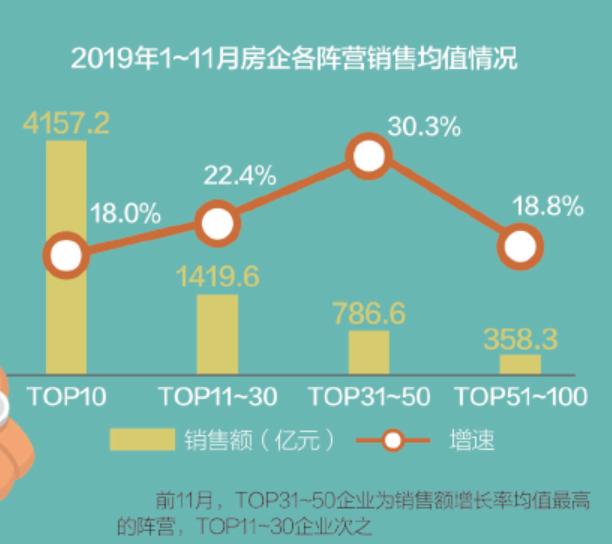 中指研究院数据显示,今年前11月,TOP10房企销售额均值为4157.2亿元,销售额增长率均值为18.0%;TOP11~30企业销售额均值为1419.6亿元,增长率均值为22.4%;TOP31~50企业、TOP51~100企业的销售额均值分别为786.6亿元和358.3亿元,增长率均值分别为30.3%和18.8%。
