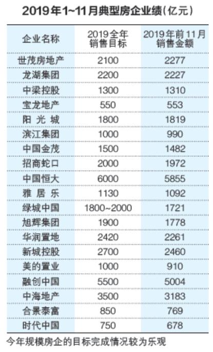 今年规模房企的目标完成情况较为乐观。亿翰智库数据显示,前11月,多家房企销售业绩完成率已超90%,完成全年业绩目标难度不大。尤其是世茂房地产、龙湖集团、宝龙地产、阳光城、中梁控股均已提前完成全年业绩目标,其中世茂房地产的业绩目标完成率为108% 。