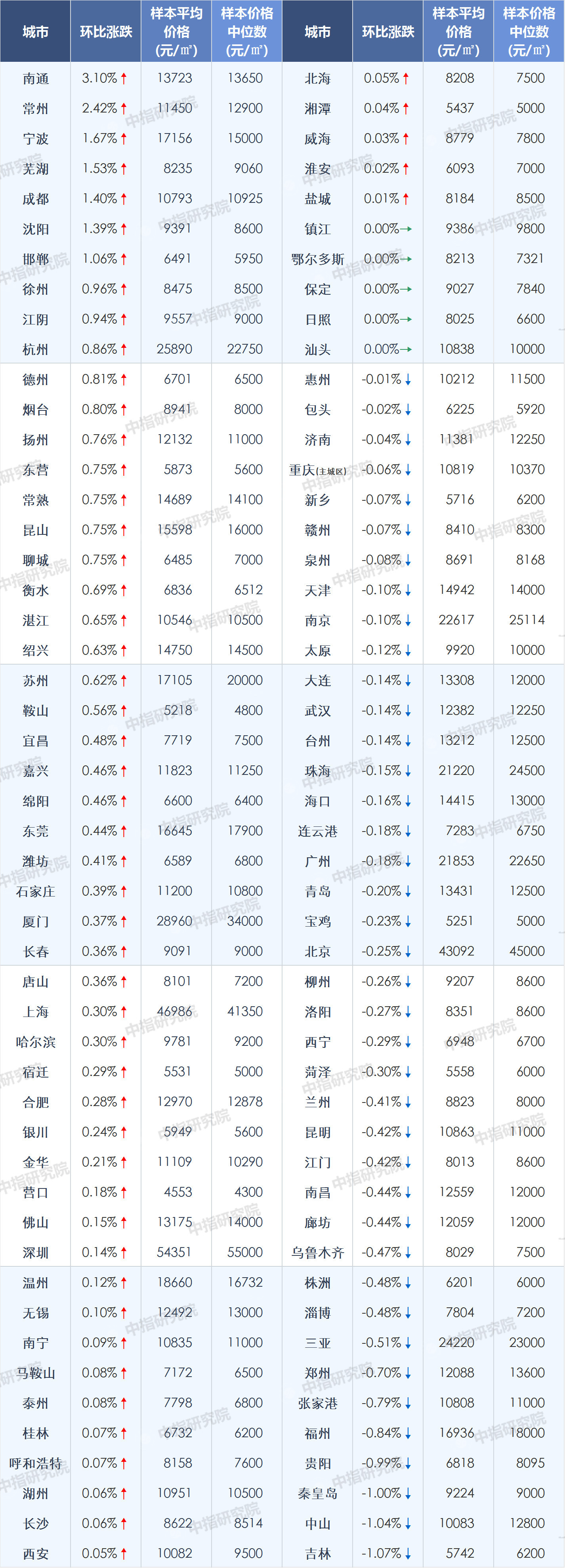 从涨跌城市变化来看,房价环比上涨的城市数量减少7个,环比下跌的城市数量增加8个,跌幅1%(含)以上的城市有3个,较上月增加1个。