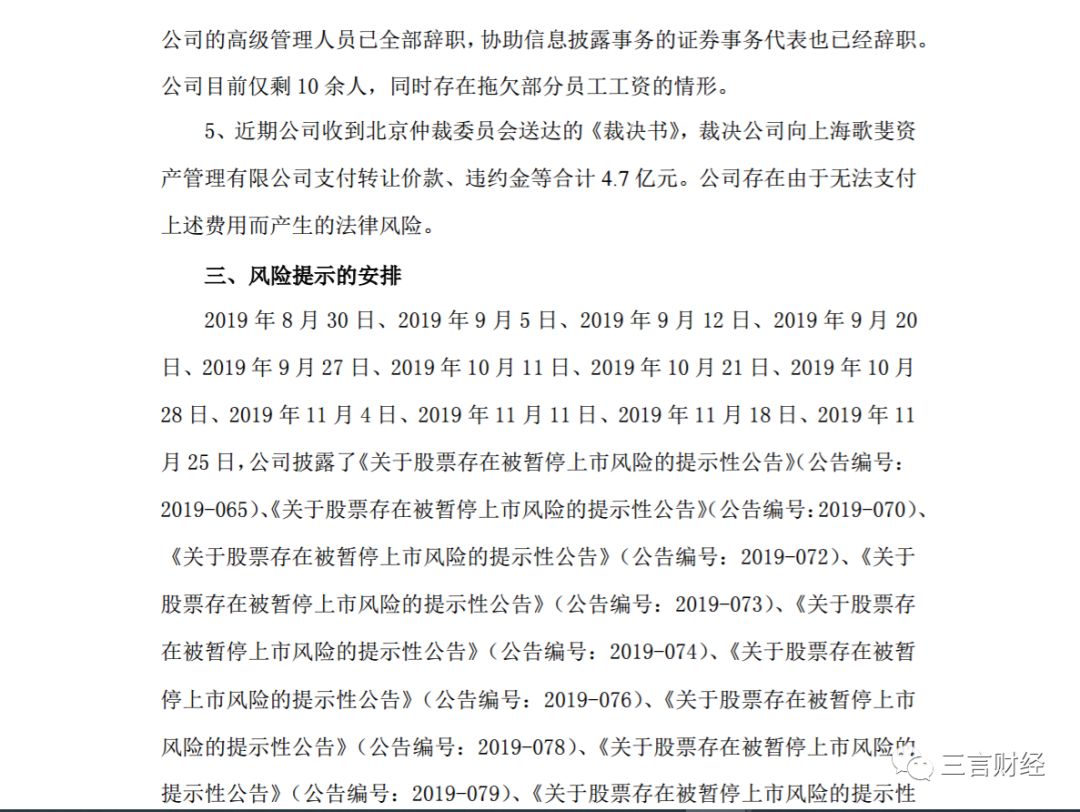 四,近期公司收到北京仲裁委员会送达的《裁决书》,裁决公司向上海歌斐资产管理有限公司支付转让价款、违约金等合计 4.7 亿元。公司存在无法支付上述费用产生的法律风险;